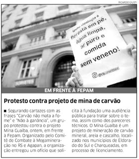 Ontem (4), o Comitê de Combate à Megamineração no Rio Grande do Sul (CCM_RS) realizou uma manifestação em frente à sede da Fepam (Fundação Estadual de Proteção Ambiental), em Porto Alegre (RS), para somar às diversas manifestações que chegaram ao órgão ambiental estadual exigindo a realização de uma audiência pública na capital gaúcha para debater o projeto Mina Guaíba, da empresa Copelmi Mineração Ltda.
