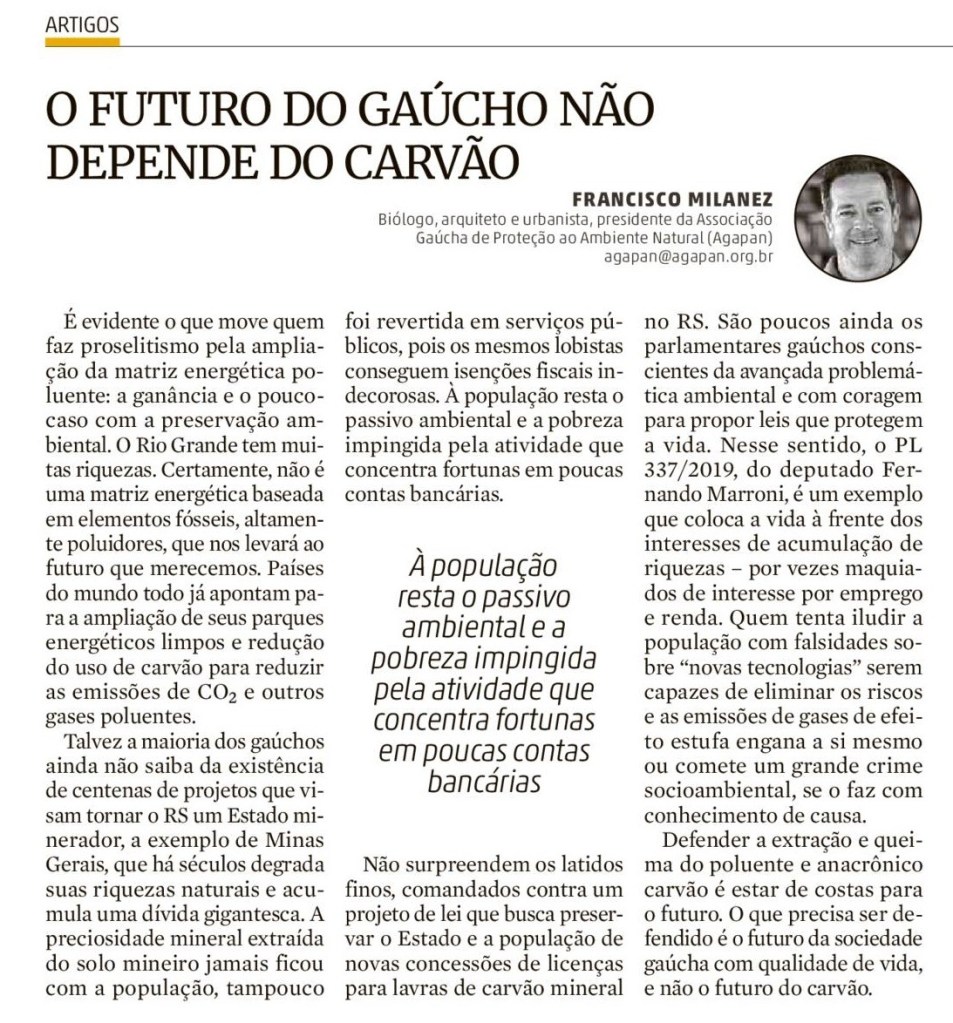 *Artigo publicado originalmente no jornal Zero Hora, edição de 13 de maio de 2021. O texto é uma contraposição ao artigo “O Futuro do Carvão Gaúcho”, divulgado no mesmo veículo no dia 7 de maio, no qual o presidente do CRM evidencia os interesses meramente econômicos da exploração do carvão.