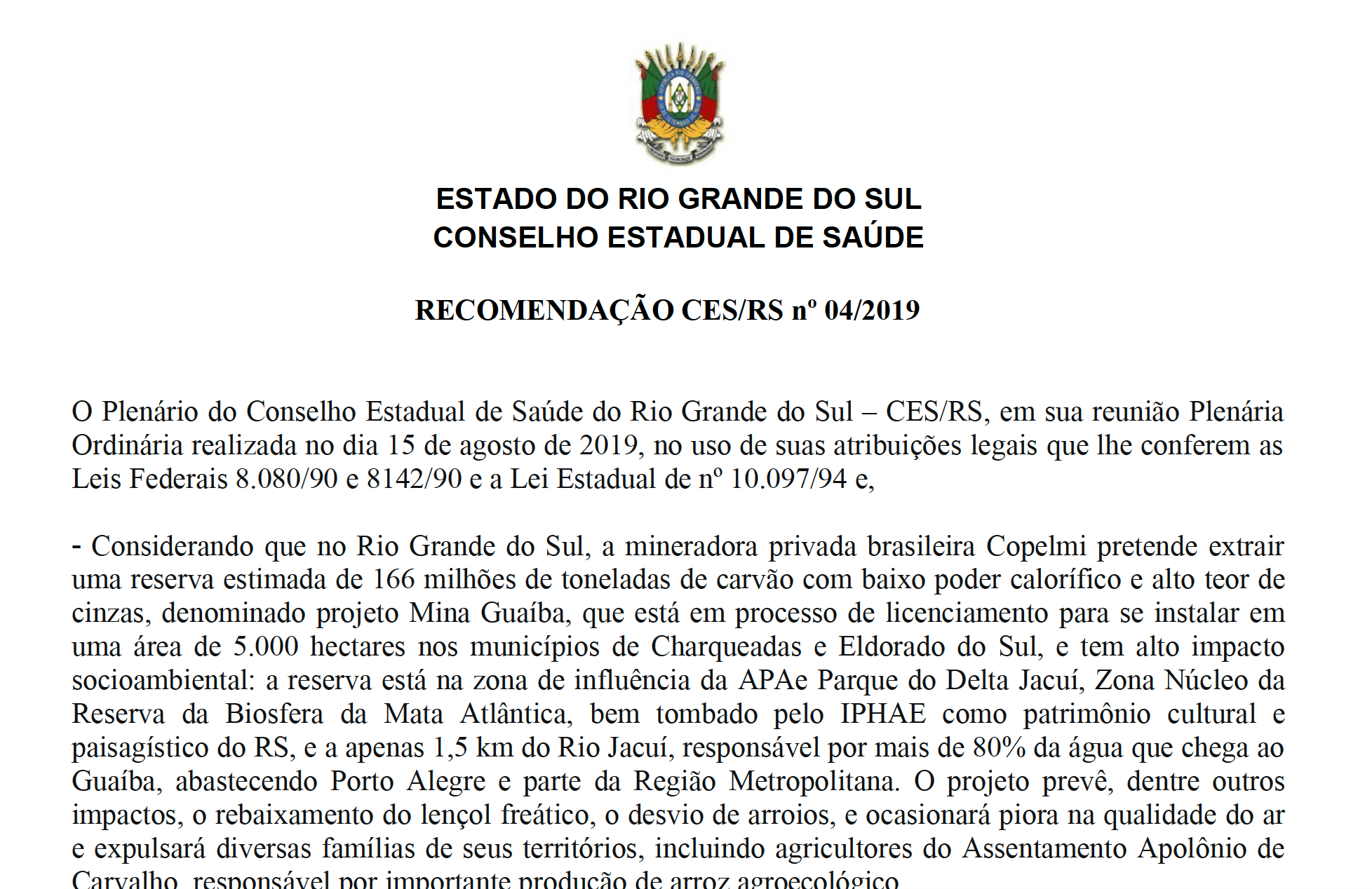 Através da recomendação 04/2019, Conselho Estadual da Saúde se posiciona contrário à instalação da Mina Guaíba.